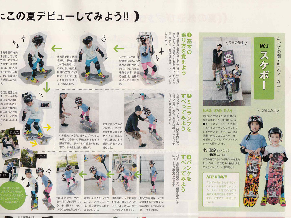 ブログ 雑誌 “nina’s” スケボー体験 2014-08-18 7:43 PM01451Views SHARE 少し前になりますが、mamaとkidsの雑誌 “nina’s”中の「この夏デビューしてみよう」というKIDS体験企画で TEAM FLAKEから YUTO,MANA,ON が講師となって、初めてのSKATEをするKIDSのお手伝いをしてきました。 初めての2人には、手取り足取り丁寧に指導 3人のTRICKも披露し、SKATEの楽しさをつたえて来ました。 そして、掲載ページがこちら
