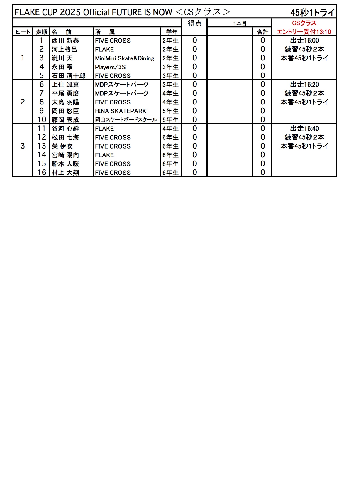 *FLAKE CUP B戦 エントリー後に、上記の条件に当てはまった選手は自動的に CSクラスへのエントリーに変更となります。