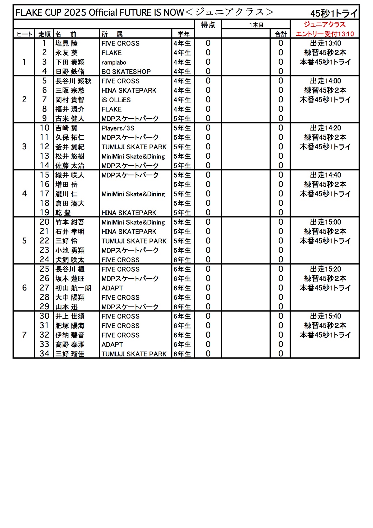 お待たせいたしました。兵庫県 MDP SkatePark にて開催となる FUTURE IS NOW の出走順と滑走時間が決まりました。