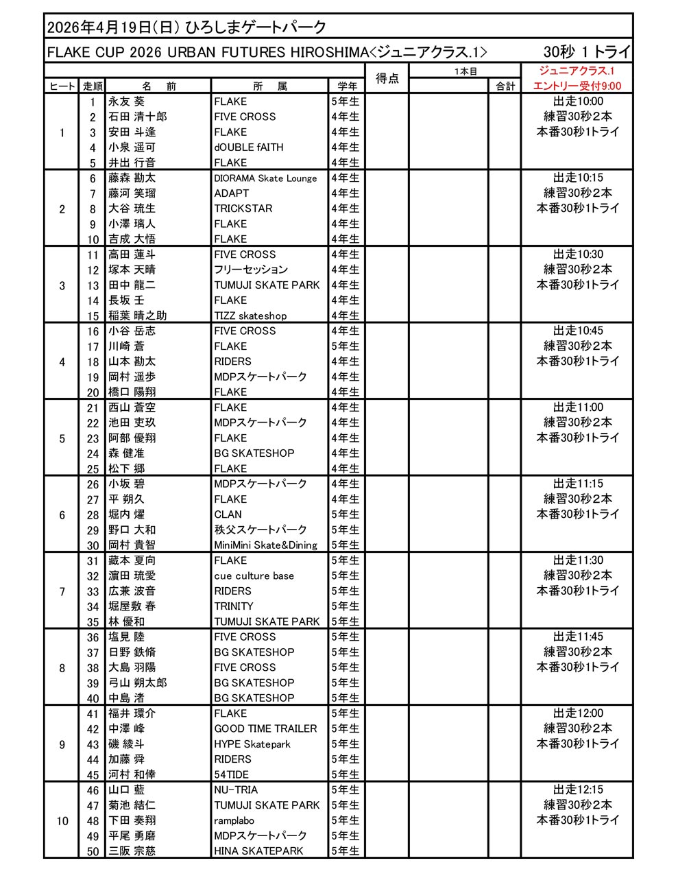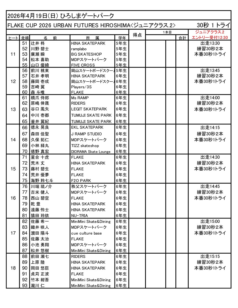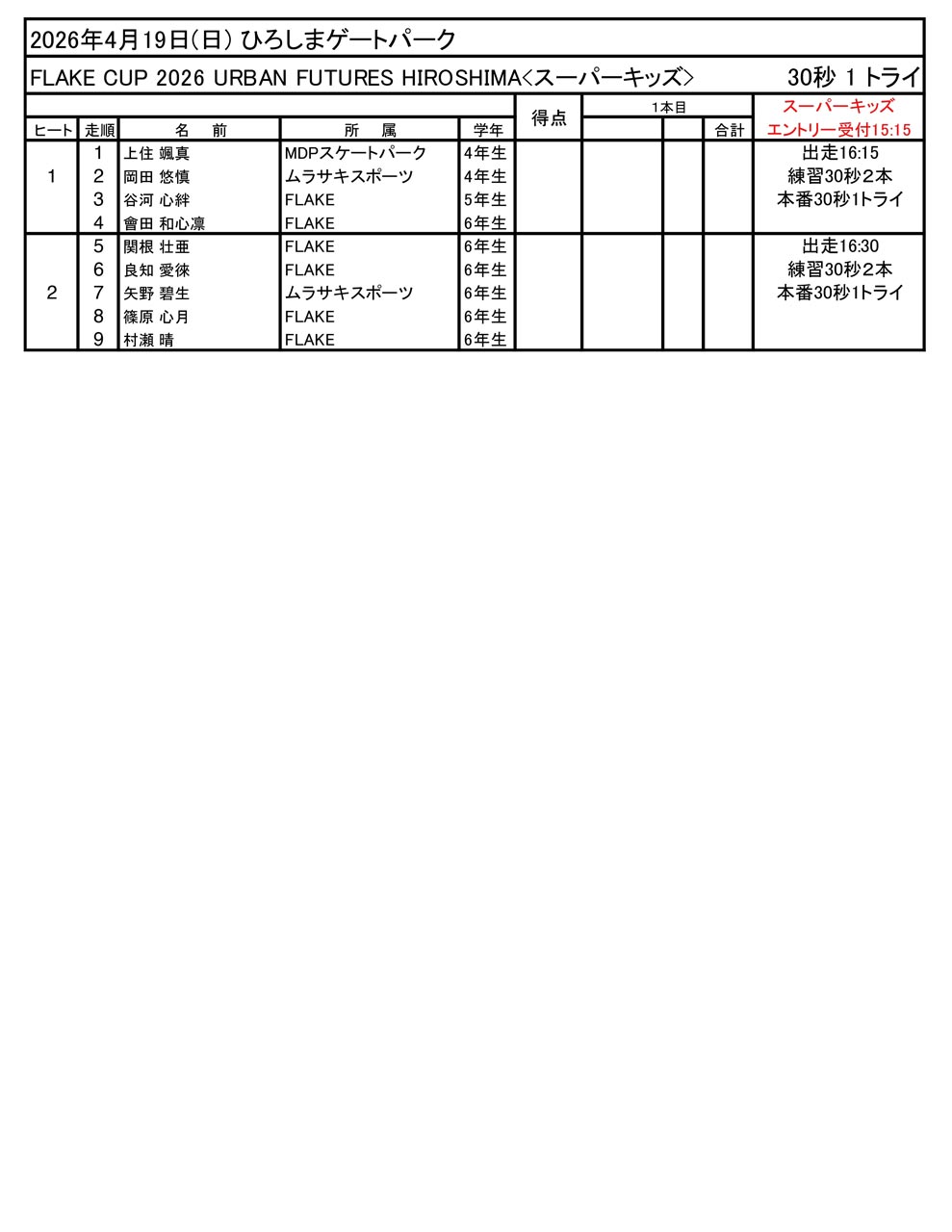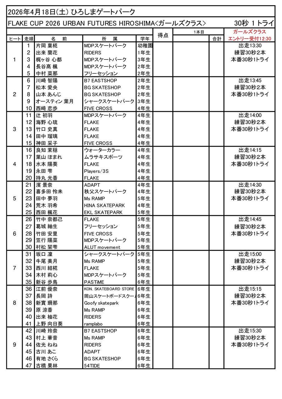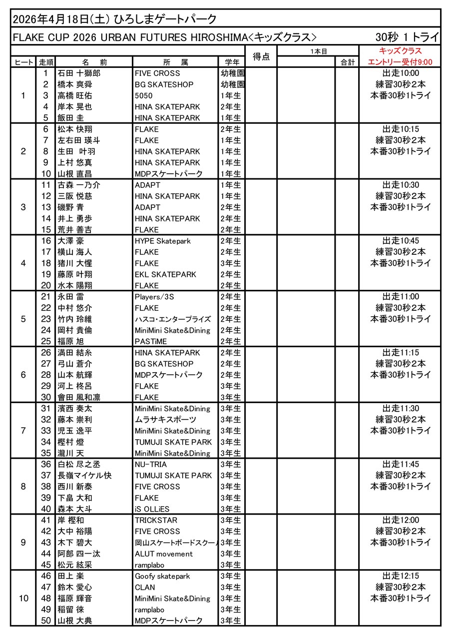 お待たせいたしました。URBAN FUTURES HIROSHIMA で開幕となる FLAKE CUP の出走順と滑走時間が決まりました。